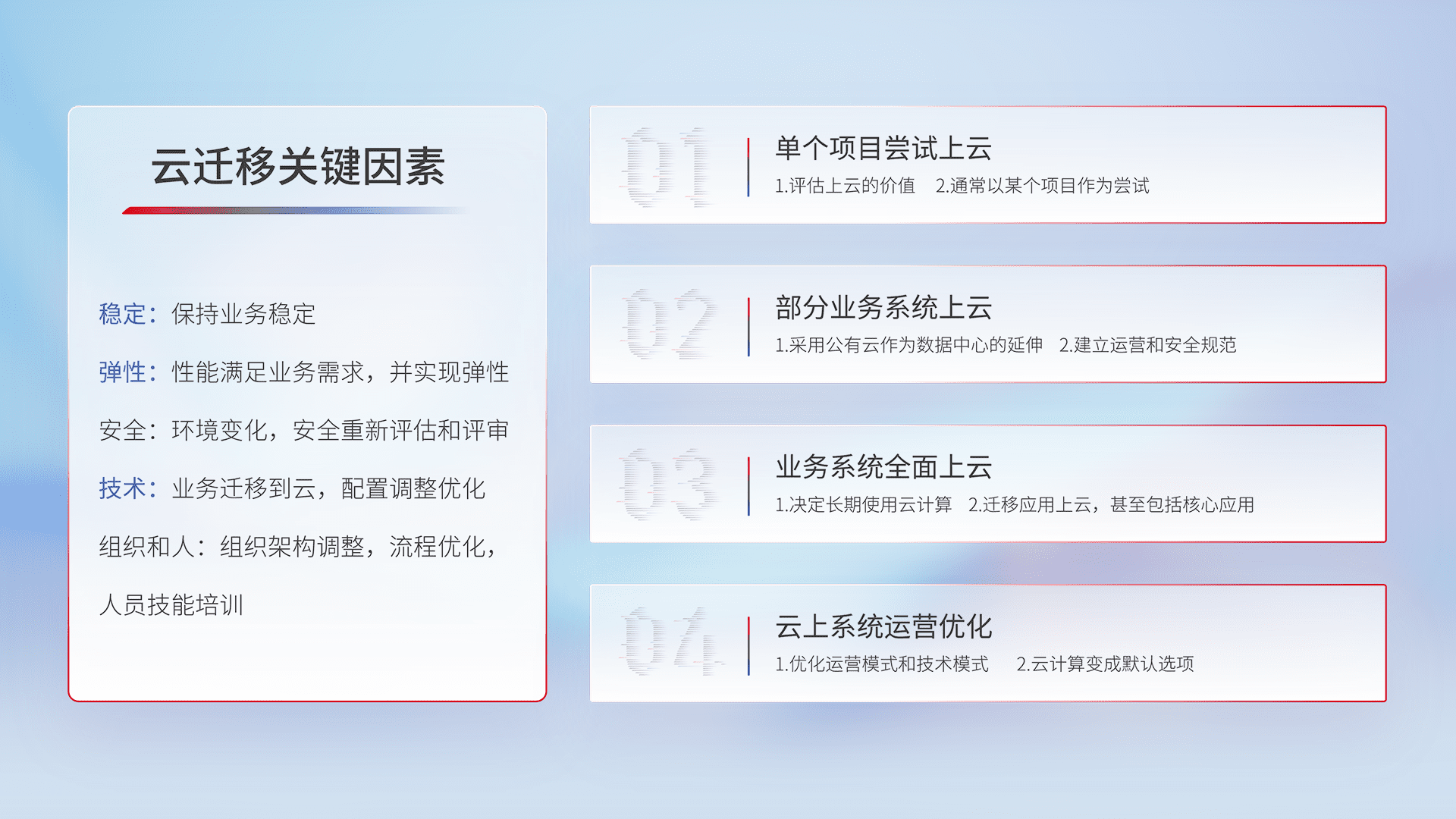 结合实际业务,,从规划设计、、、云平台选型、、、、云原生改造、、、数据迁移、、集成交付,,迁移全过程为客户识别最佳上云路径,,,,做好风险识别管理,,,设计网络架构、、、、身份权限、、、、安全审计合规、、、操作审计、、日志审计、、监控告警策略、、、多站点容灾设计等,,对云上基础设施进行整体规划,,提升IT治理水平,,以满足弹性、、高可用、、高性能的需求。。。。