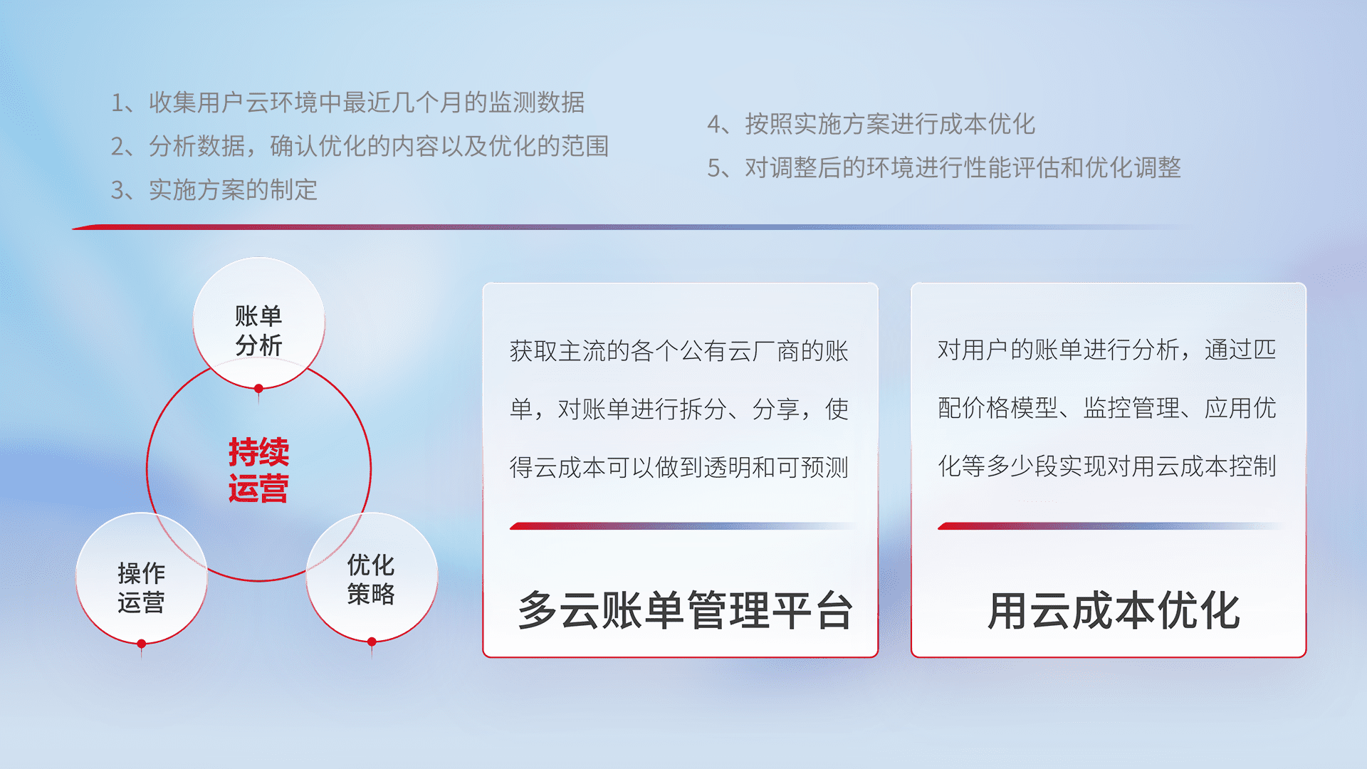 通过多云纳管,,以统一的资源数据模型把客户的云资源进行抽象和封装,,进而实现对多云资源的统一操作,,,,保障云资源管理的可靠性、、稳定性与可用性。。。量身定制化运维内容,,配置、、、开发运维、、、、补丁管理、、、备份、、、、监控、、、认证和访问管理、、审计和日常巡检等,,,保障在用云过程中的可靠度,,,稳定度以及高可用率。。。